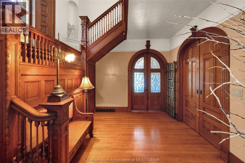 Welcome to one of Chatham’s most distinguished residences: the Matthew Wilson Homestead. Built in 1896, this Queen Anne–style estate showcases craftsmanship rarely seen today & has been carefully maintained through generations. An undertaking to build that spanned nearly four years, it offers over 5,000 square feet of living space, original blueprints, & recognition with the Mayor’s Heritage Award in 2010. The expansive front porch sets the tone, leading into a grand foyer with a sweeping staircase & an airy sense of openness. Pocket doors allow privacy or open concept style, perfect for entertaining or enjoying sun-filled rooms. The home offers 6 bedrooms, 3.5 baths, soaring ceilings, original hardwood, & 19 stained-glass windows (18 original and one from Chatham Vocational School). Period details include a functioning dumbwaiter, slate roof, laundry chute from the servants’ quarters, butler’s pantry, approx. 9-foot doors with original woodwork, & plaster construction — all testaments to the enduring quality of the build. The dining area connects seamlessly to the butler’s pantry & kitchen, with an additional pantry for storage. The second level features a large hallway, 4 bedrooms, and 2 full baths, including the updated primary suite with walk-in closets. The rear staircase leads to a full 3rd level with 2 more bedrooms, a large bathroom, & a spacious ""playroom"" with tourette and full kitchen. With its own exterior access, this level offers flexibility for an in-law suite, guest quarters, or rental potential. Modern updates ensure comfort, including a renovated kitchen (2016), updated baths, forced-air gas heating, central air, 200-amp service, copper plumbing, and new water line. The large backyard with carriage house garage allows for extra storage and space for your needs. Opportunities to own a residence of this scale and history are rare. Schedule your private showing and experience the legacy of 325 Wellington St. W for yourself. Home is Where the Hart is! (id:47966)